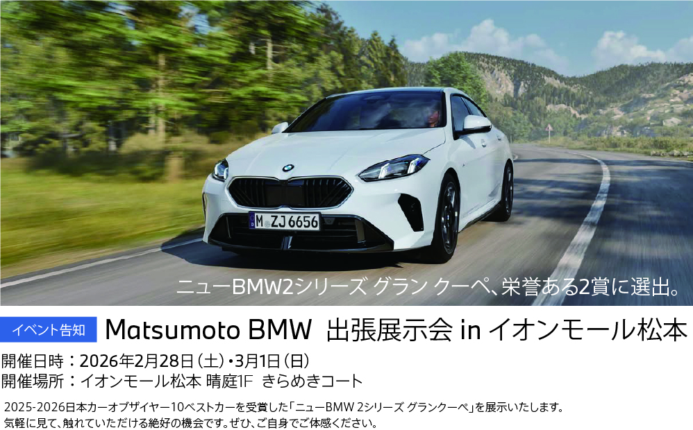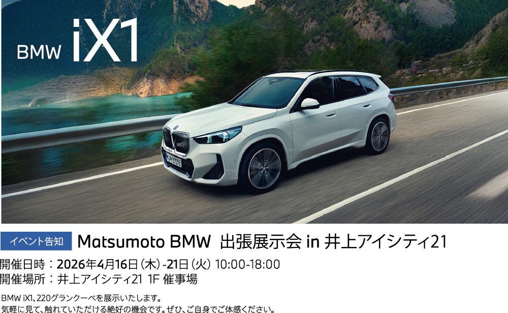 本社ショールーム 【BMW M 販売店】【BMW i 販売店】国道19号線村井下町北交差点から東へ200メートル程の場所に位置し、利便性に優れた好アクセスな環境に、新車ショールームとサービス工場が併設されています。美しく広がる北アルプスの背景によって演出された、オープンカフェの様な開放感あるショールームで、最新のBMWをゆっくりとご覧いただけます。商談スペースは、初めてご来店される方でも気軽にお話いただける空間づくりを心がけています。テスト・ドライブ・カーもBMWの“駆けぬける歓び”を心ゆくまでご体感していただけるよう多数ご用意しておりますので、是非お気軽にお申込み下さい。経験豊かなセールス・コンサルタントは、お客様のお車選びをお手伝いさせていただくだけでなく、BMWに関する些細な疑問にも誠実にお答え致します。Matsumoto BMWスタッフ一同、皆様のご来店を心よりお待ちしております。